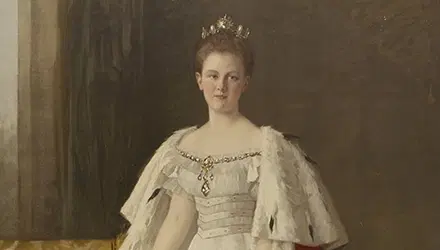 In het eerste portret leren we haar kennen als het kind. Toen haar vader, Koning Willem III, in 1890 overleed, was Wilhelmina pas tien jaar oud. Omdat zij nog te jong was om te regeren, nam haar moeder, Koningin-regentes Emma, de honneurs waar. Op de vroege foto’s, schilderijen en de allereerste postzegels zien we een onschuldig meisje met lang, loshangend haar. Dit jeugdige, zachte beeld was precies wat het koningshuis op dat moment nodig had: het vertederde de bevolking, wekte sympathie op voor de Oranjes en herstelde het ietwat beschadigde imago van de monarchie.